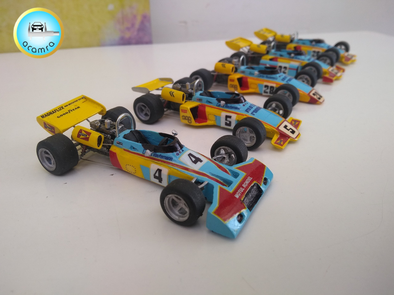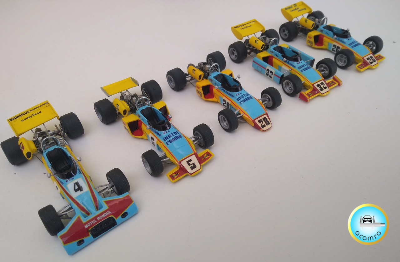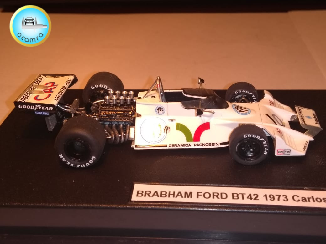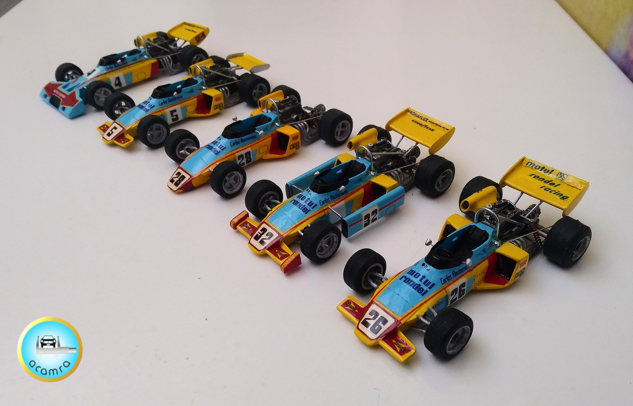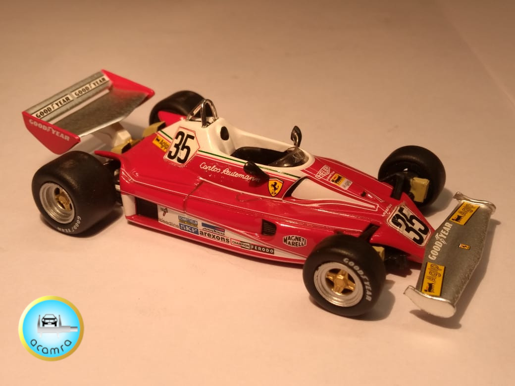 Daniel Garay (Bs. As.), nos hace una selección de los modelos pilotados por Carlos Reutemann: Ford Falcon Angostado V8 (F100). Turismo de Carretera; Ferrari 312 PB. Le Mans , 1973. Prototipos; McLaren M7C – Ford Cosworth. Fórmula 1, de la escudería de Jo. Bonnier (debut F1); Brabham Ford BT 34; Brabham Ford BT 42; Brabham Ford BT 44; Brabham Alfa Romeo BT 45; Ferrari 312 T2; Ferrari 312 “T6”, six-wheeler. Seis ruedas (traseras duales), basada en una 312 T2; Lotus 79 – Ford; Williams Ford FW07.